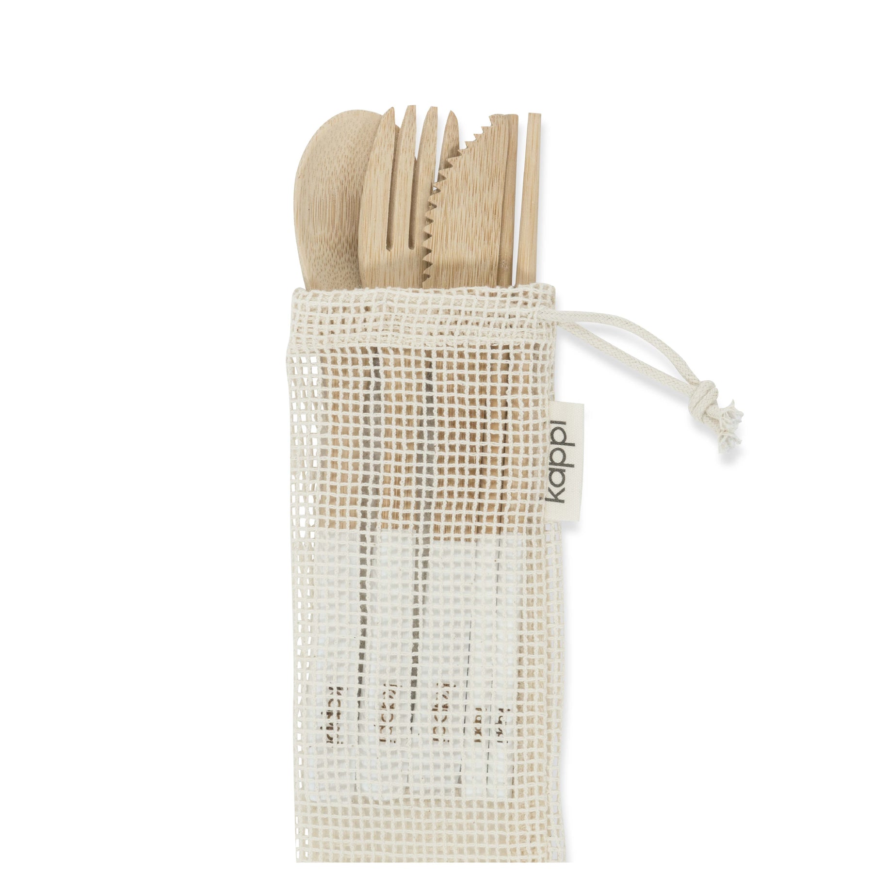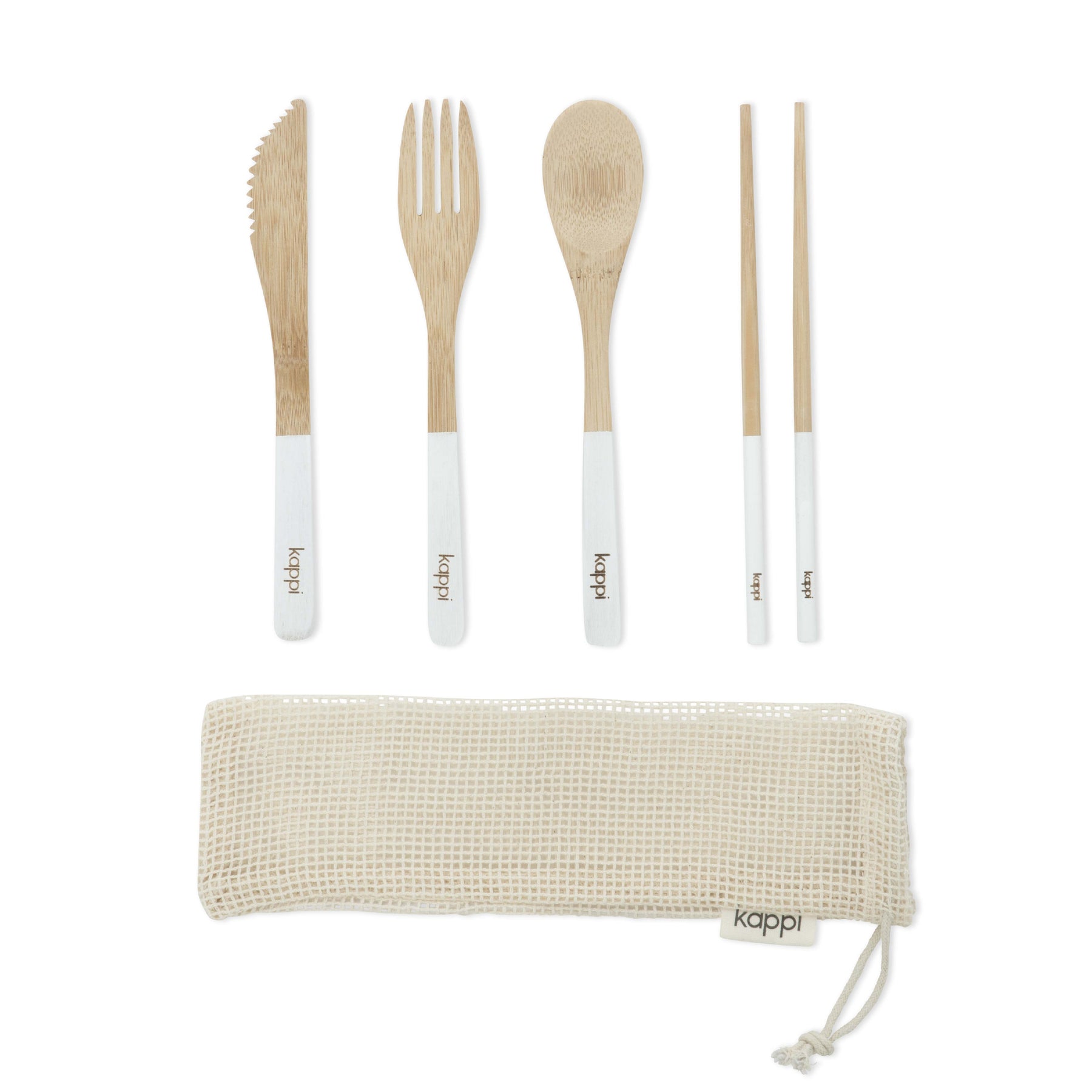 Here at Kappi.com.au, we have created a seriously eye-catching and wonderfully functional kit that is ideal for those who bring their food with them, and are sick of the noise of stainless steel forks and knives clanking in their bag, or cannot bear the thought of using brittle plastic forks and knives that are full of harmful toxins. Instead, we bring to the market a small and lightweight alternative that comes in its very own cotton mesh carry pouch and includes a bamboo fork, knife, spoon and set of chopsticks.